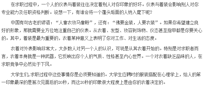 除了簡約,干凈也是面試時要特別注意的,你的著裝再得體,也必須保持干凈整潔,這是最起碼的要求。干凈整潔不僅僅是指衣服,頭發(fā)的整潔也很重要,如果頂著一頭亂蓬蓬的頭發(fā)會讓面試官認為你不善于打理自己、不善于管理時間,這樣的印象對你的面試無疑是不利的。另外,面試前還要注意一下自己的衣服是否平整,最好是熨燙過的衣服,如果學校里沒有條件熨衣服,可以在面試前一夜把衣服掛起來,這樣也可以保持衣服的平整。
