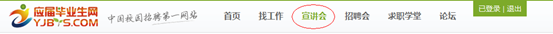 1)進(jìn)入應(yīng)屆畢業(yè)生網(wǎng)(m.yfngvb.cn )首頁(yè),在網(wǎng)站首頁(yè)頂部導(dǎo)航欄點(diǎn)擊“宣講會(huì)”,即可進(jìn)入“YJBYS宣講會(huì)查詢(xún)系統(tǒng)”,你也可以輸入 直接進(jìn)入該系統(tǒng)。