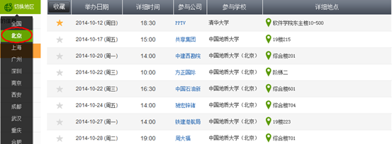 ②如果你希望了解某個(gè)城市發(fā)布的宣講會(huì)信息,你可以在界面的左邊導(dǎo)航欄中選擇切換地區(qū),選擇其中任何一個(gè)城市,你將會(huì)查到該城市所有已發(fā)布但是還未過(guò)期的宣講會(huì)信息,例如選擇北京,你將會(huì)得到北京地區(qū)企業(yè)發(fā)布的信息。