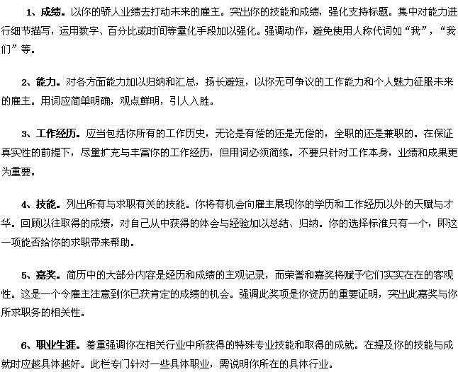 簡(jiǎn)歷中有幾欄是用來給對(duì)方留下深刻印象的,也是決定對(duì)方是否給你面試機(jī)會(huì)的關(guān)鍵。如何寫好這幾部分的內(nèi)容很重要,請(qǐng)從以下幾個(gè)方面著手。