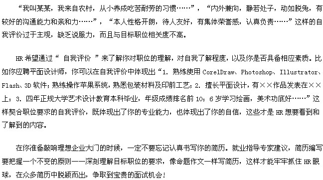 很多求職者在“期望從事職業(yè)”一欄處,填寫若干個,甚至是完全不相關(guān)的職業(yè)。HR第一眼就會排除這些求職意愿不明確的求職者,HR有理由相信,一個不知道自己會做什么的求職者,一定不清楚自己擅長什么,也無法做好分配給他們的工作。HR同樣會相信,一個認(rèn)為自己什么都能干的人實際上恰恰什么也干不好,更不敢錄用。