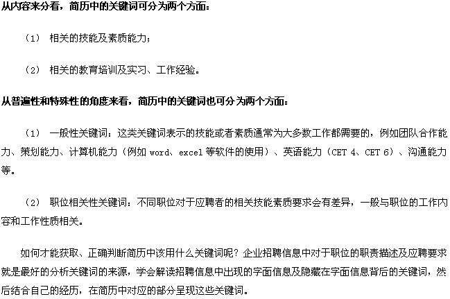 HR平均瀏覽一份簡(jiǎn)歷的時(shí)間不超過30秒,在這么短的時(shí)間內(nèi),HR主要是通過查看簡(jiǎn)歷中是否有相關(guān)的關(guān)鍵詞來進(jìn)行判斷。關(guān)鍵詞的作用尤其在網(wǎng)申簡(jiǎn)歷中更為明顯。如果你是應(yīng)聘互聯(lián)網(wǎng)行業(yè)相關(guān)度的職位,HR可能會(huì)對(duì)簡(jiǎn)歷中的“網(wǎng)站”、“流量”、“×××××.com”(網(wǎng)址域名)等關(guān)鍵詞比較敏感;如果你應(yīng)聘財(cái)務(wù)類職位,HR可能會(huì)對(duì)簡(jiǎn)歷中的“會(huì)計(jì)”、“財(cái)務(wù)管理”、“財(cái)務(wù)軟件”等關(guān)鍵詞比較敏感……所以在寫簡(jiǎn)歷前,你應(yīng)該針對(duì)應(yīng)聘的職位、公司甚至行業(yè),想一想需要在簡(jiǎn)歷中加上哪些關(guān)鍵詞,這些關(guān)鍵詞可以分別對(duì)應(yīng)到你的簡(jiǎn)歷的哪部分內(nèi)容,以什么樣的描述方式來呈現(xiàn)。