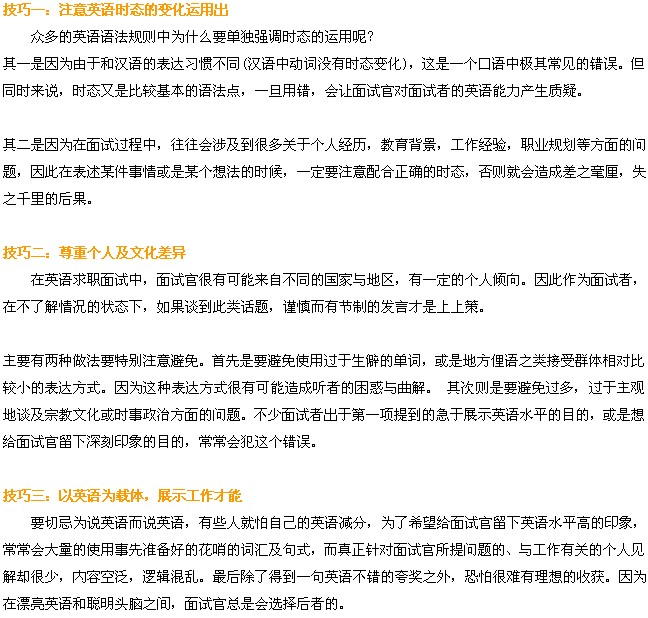 很多畢業(yè)生都有這樣的經歷,當進入面試階段有可能會遭遇英文面試,不過這也預示著你夢想的職位正向你招手,這輪面試的份量可想而知,所以你應該確保在面試中發(fā)揮最佳狀態(tài)。英文交流無障礙的應聘者為數(shù)不多,大多數(shù)人都處于有一定交流基礎、但經驗不足的水平,現(xiàn)在介紹一些面試中的技巧及例子,希望幫助英文水平并不是特別出眾的你。